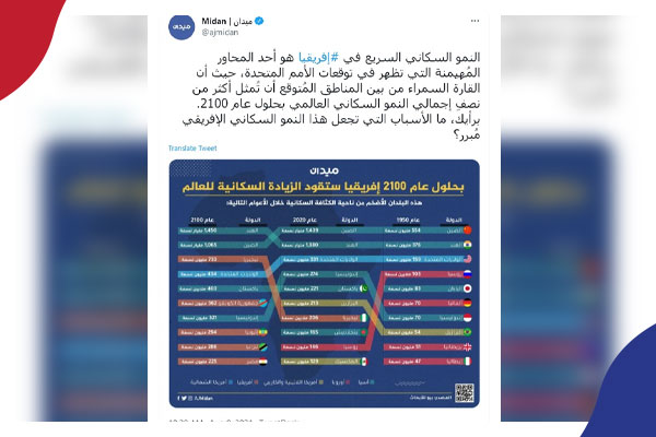 النمو السكاني السريع في #إفريقيا هو أحد المحاور المُهيمنة التي تظهر في توقعات الأمم المتحدة، حيث أن القارة السمراء من بين المناطق المُتوقع أن تُمثل أكثر من نصفِ إجمالي النمو السكاني العالمي بحلول عام 2100. برأيك، ما الأسباب التي تجعل هذا النمو السكاني الإفريقي مُبرر؟