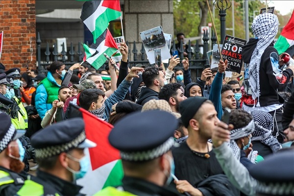 وتجمع الناس خارج داونينغ ستريت في لندن ووسط مدينة "مانشستر" و"بيرمنجهام" و"برادفورد"؛ للتعبير عن غضبهم تجاه العنف المرتكب ضد الفلسطينيين في القدس المحتلة.