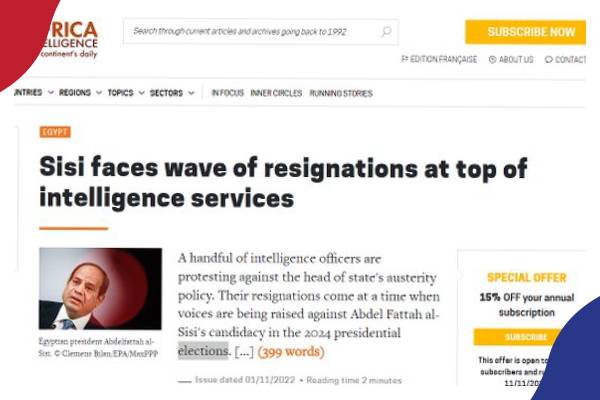 يوم 1 نوفمبر 2022 أكد تقرير لموقع Africa Intelligence وهو موقع استخباراتي فرنسي ذو مصداقية، أن جهاز المخابرات العامة في مصر يشهد موجة استقالات احتجاجا على سياسة التقشف الاقتصادي التي ينفذها السيسي وتدفع الشعب للثورة.