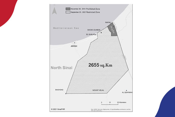 وصدر القرار الخطير الذي يحمل رقم 420 لسنة 2021 دون أدنى مناقشة مجتمعية أو إعلامية تذكر، ونشرته الجريدة الرسمية في 23 سبتمبر 2021 دون تقديم أي تفسيرات. ويشمل القرار الكثير من القرى والتجمعات السكنية ومدن رئيسية لازالت تضم آلاف السكان، ضمن المناطق المحظورة، كما يعني القرار عمليا صعوبة أو استحالة عودة آلاف السكان الذين هجرهّم الجيش قسريا في السنوات الماضية تحت ذريعة مكافحة الإرهاب إلى المدن والقرى التي صارت محظورة.
