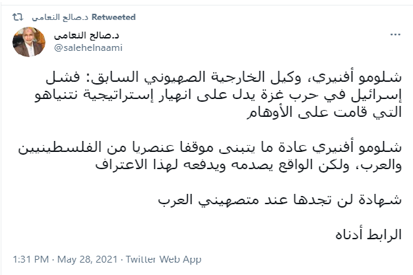 غرد الدكتور صالح النعامي، المحلل الفلسطيني المختص في الشئون الصهيونية، قائلا: "شلومو أفنيري، وكيل الخارجية الصهيوني السابق: فشل إسرائيل في حرب غزة يدل على انهيار إستراتيجية نتنياهو التي قامت على الأوهام
