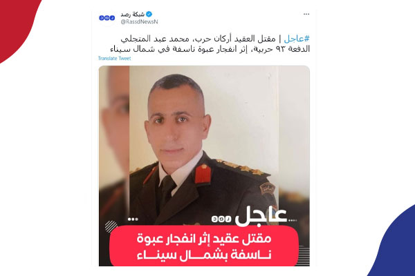 مقتل العقيد أركان حرب، محمد عبد المتجلي الدفعة ٩٣ حربية، إثر انفجار عبوة ناسفة في شمال سيناء الرابط